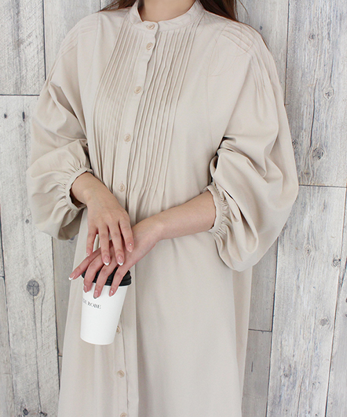 たくさん入ったタックが印象的なワンピースが登場。膨らみのあるボリューミーなスリーブと、